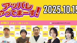 アッパレやってまーす 水曜日(MBSラジオ)2025年10月15日放送回の感想でーす。 この番組はメンバーが最高で聴きやすいので毎回欠かさずチェックしています。 アッパレやってまーす、は各曜日とも面白くて、ラジオなの出演者が多いのが特徴です...